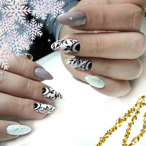 Сочетание приглушенного оттенка лака с росписью вензелями не оставит равнодушной ни одну поклонницу изящного маникюра.